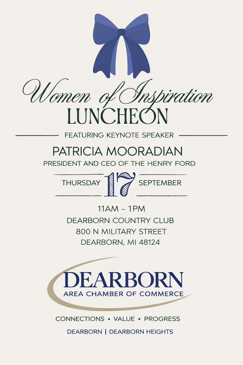 Dearborn Country Club 800 N Military, Dearborn, MI, United StatesJoin the Dearborn Area Chamber of Commerce for our annual Women of Inspiration Luncheon — a special afternoon dedicated to celebrating leadership, innovation, and the incredible impact of women in business and our community. This year, we are honored to welcome Patricia Mooradian, President & CEO of The Henry Ford, as our keynote speaker. Patricia […]